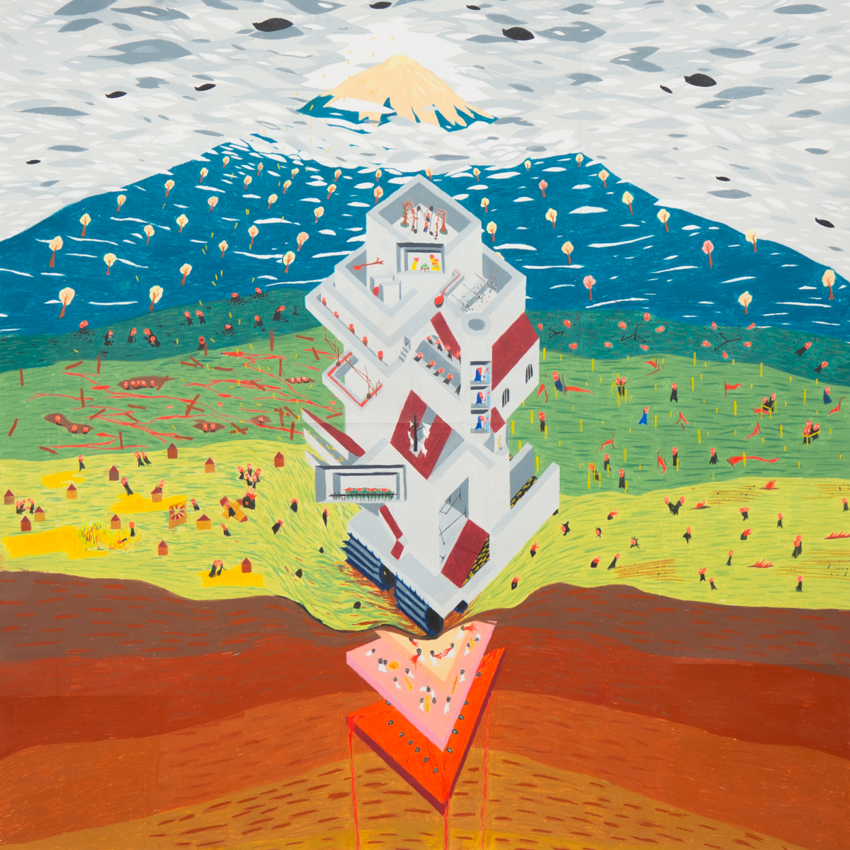 Dans cette exposition, il sera question de couleur. Mais pas seulement. Colorama est la contraction de couleur et panorama. Le sujet est donc aussi le regard, celui porté tout en largeur sur le monde alentour, dont l’artiste forme le centre. Du dialogue qui s’instaure entre la critique sociale de Lucie Kohler, les excursions fantastiques de Caroline Tschumi et les utopies conceptuelles d´Eloi Gigon, émerge ce point commun, cet attachement aux couleurs vives et à la description d’un monde intériorisé par la technique du dessin. L’exposition offre ainsi un aperçu de pratiques contemporaines issues d’une simplicité de moyens radicale : le crayon de couleur, le neocolor, la craie grasse. Quel que soit le sujet, quel que soit le format, la réponse au défi de donner forme aux visions du monde actuel se formule ici sur une simple feuille de papier.
