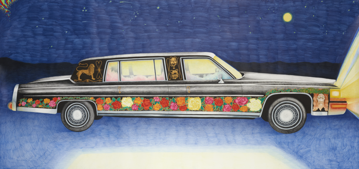 Caroline Tschumi, Longue Noire Limousine (pour Steven), 2025 Crayons de couleur sur papier, 150 x 270 cm. Courtoisie de l’artiste
